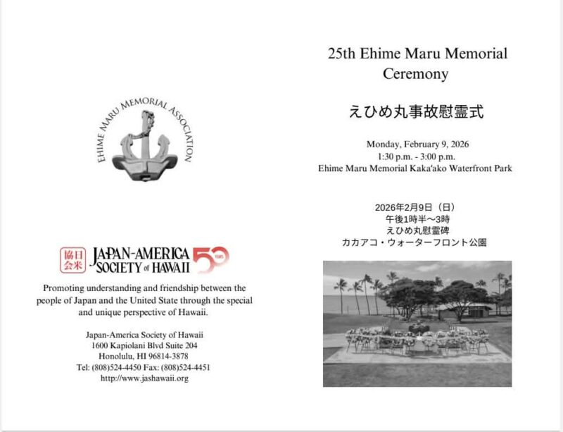 2026年2月9日、ホノルルにて開催予定であった第25回えひめ丸事故慰霊式は、悪天候により州の非常事態宣言が発令され、市立公園が閉鎖されたことから、カカアコ・ウォーターフロント・パークでの公式式典は中止となりました。